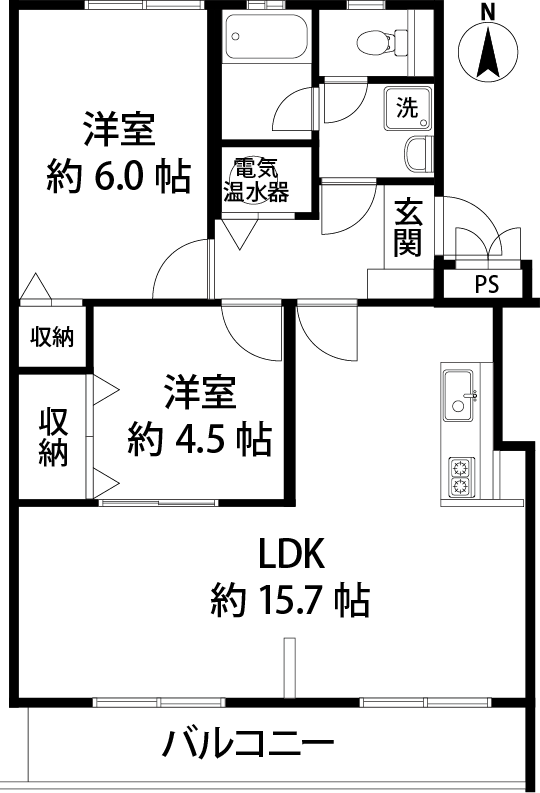 間取内訳:洋室約6.4帖、4.5帖、LDK15.7帖
